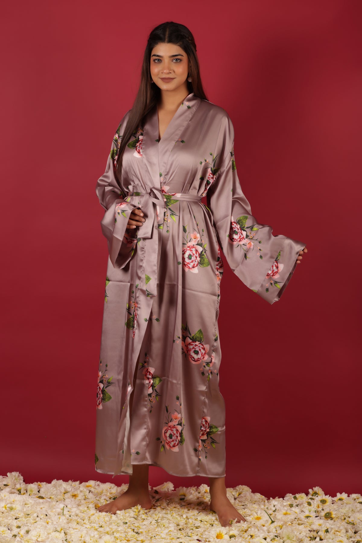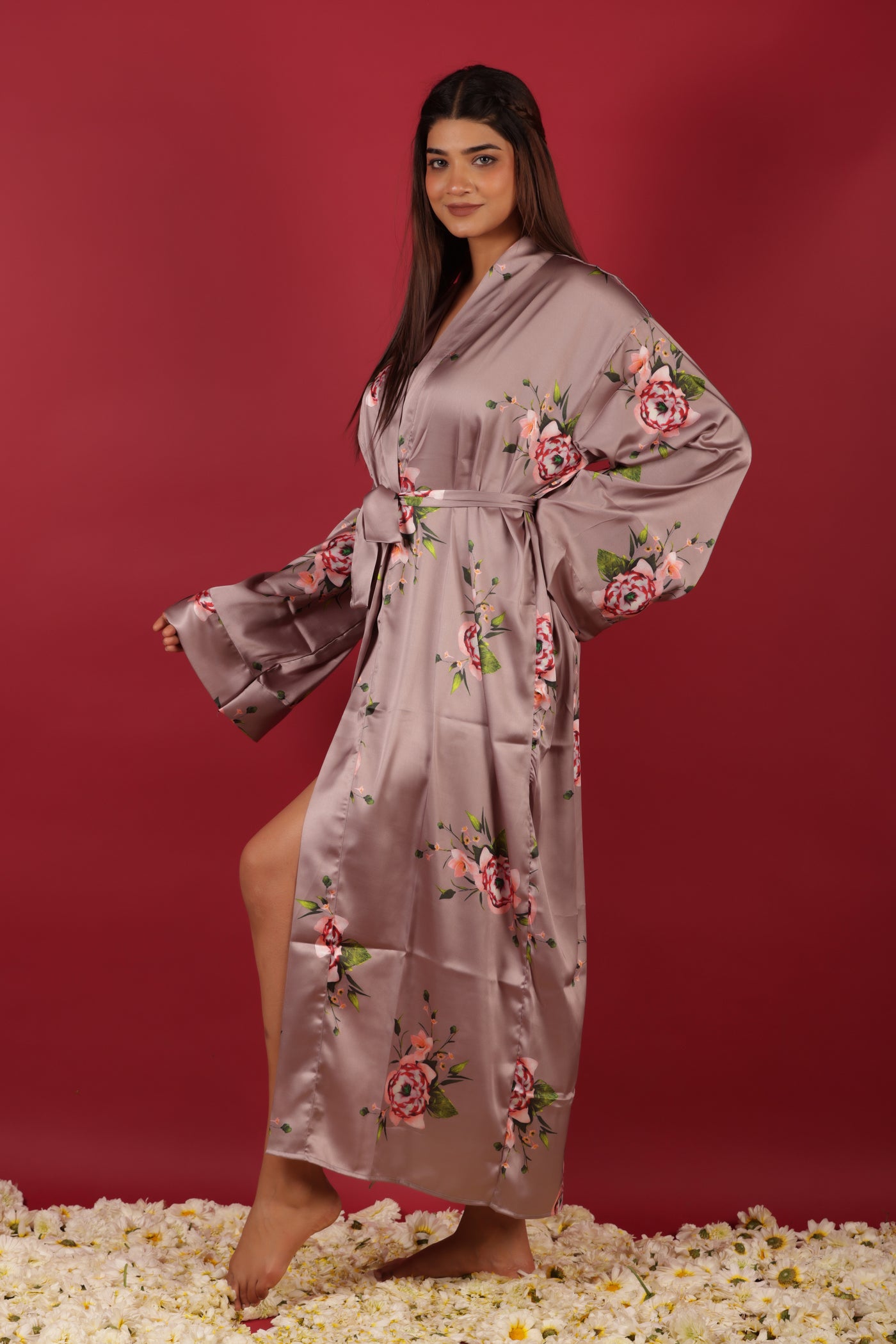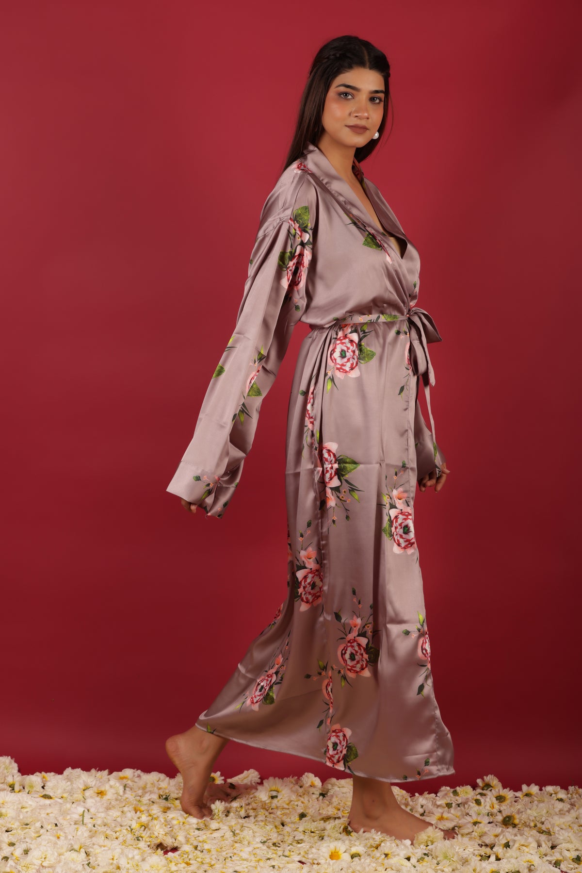 Beautiful Peach Colored Floral Printed Morning Robe Dress