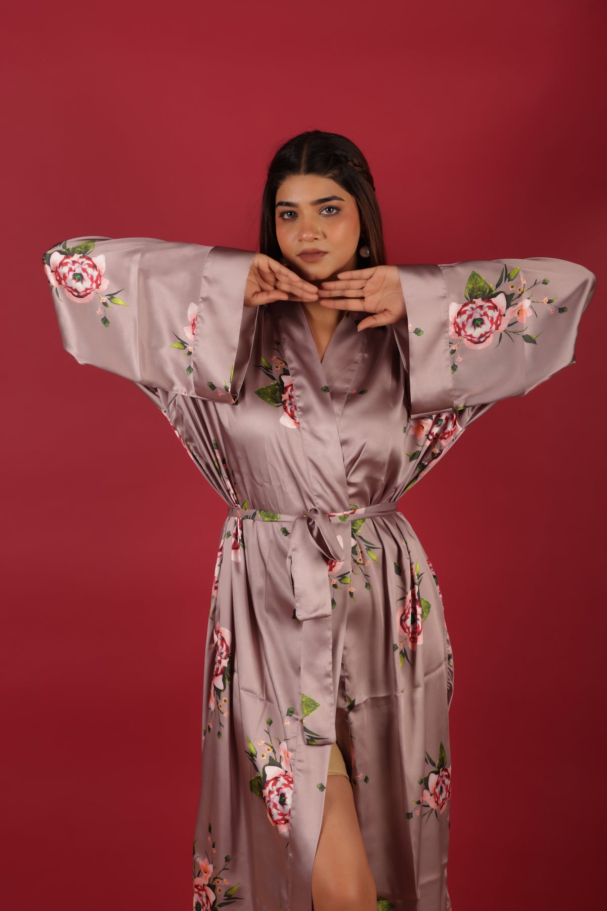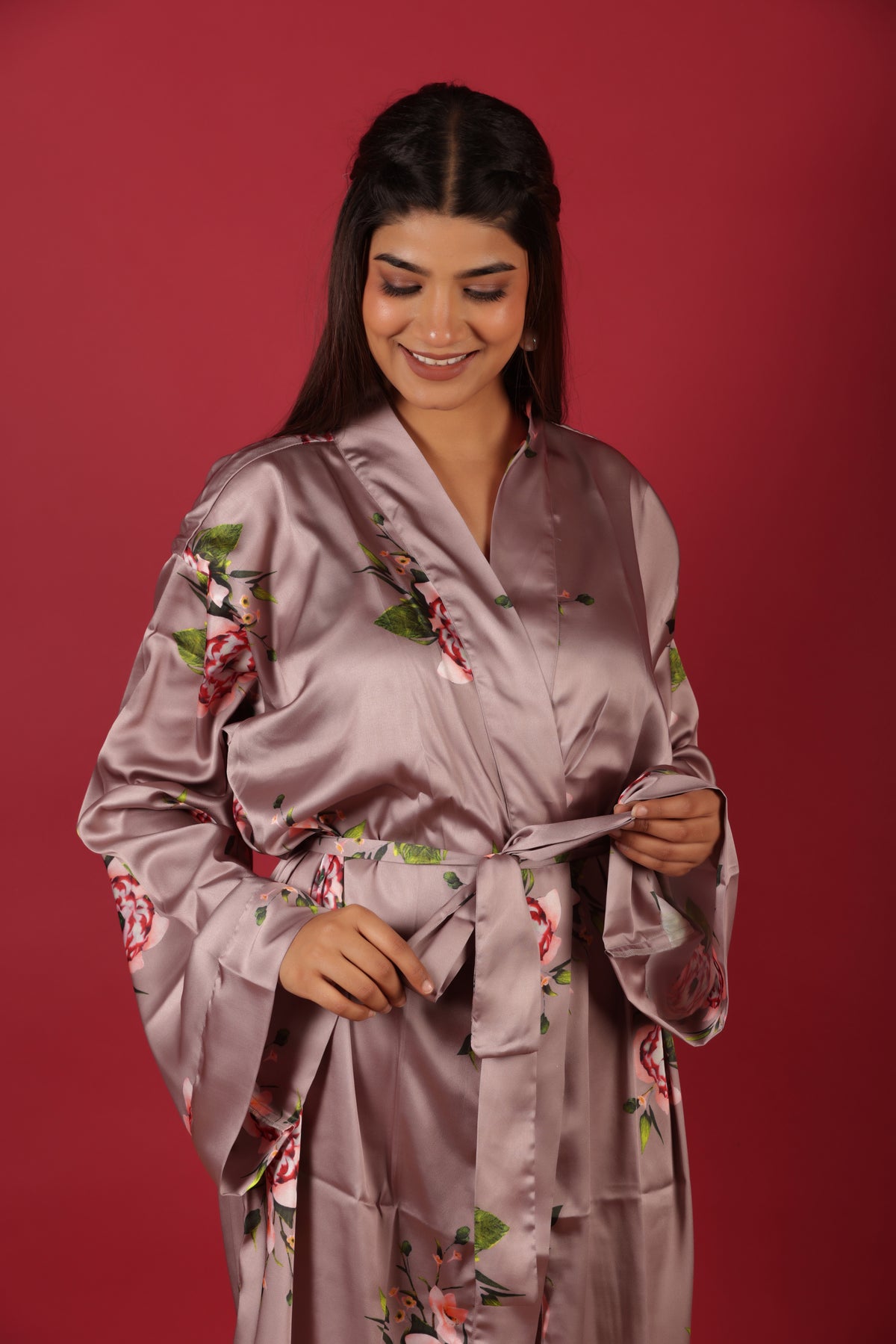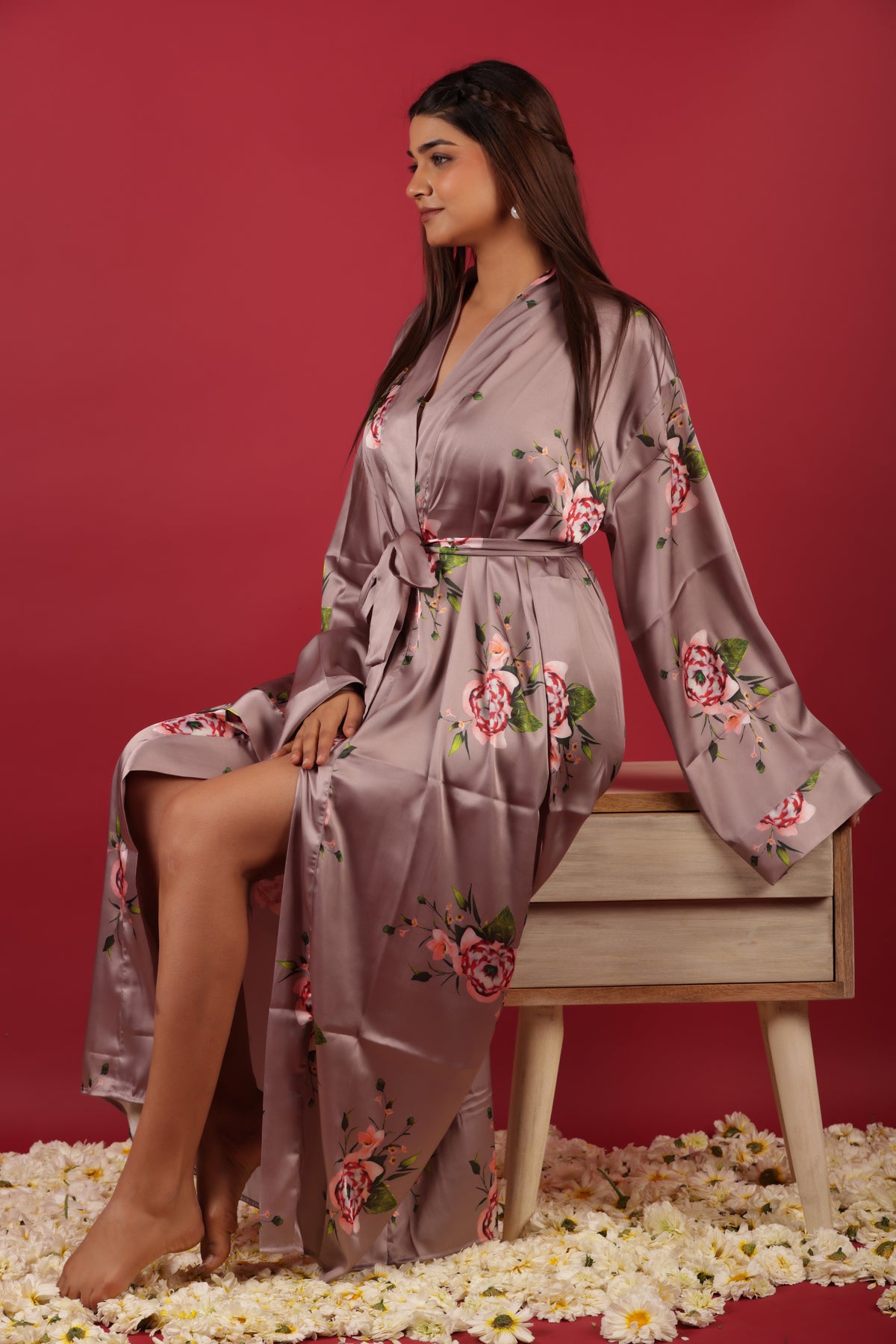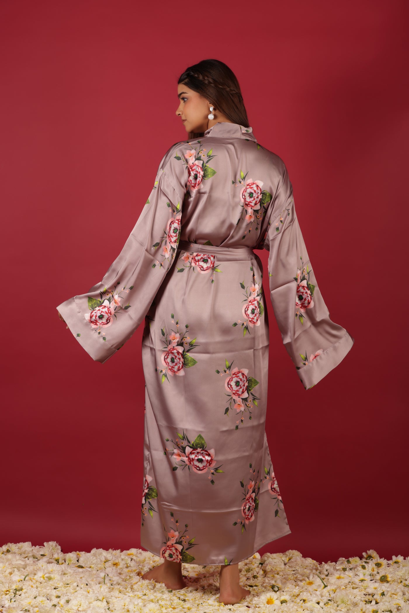 Beautiful Peach Colored Floral Printed Morning Robe Dress